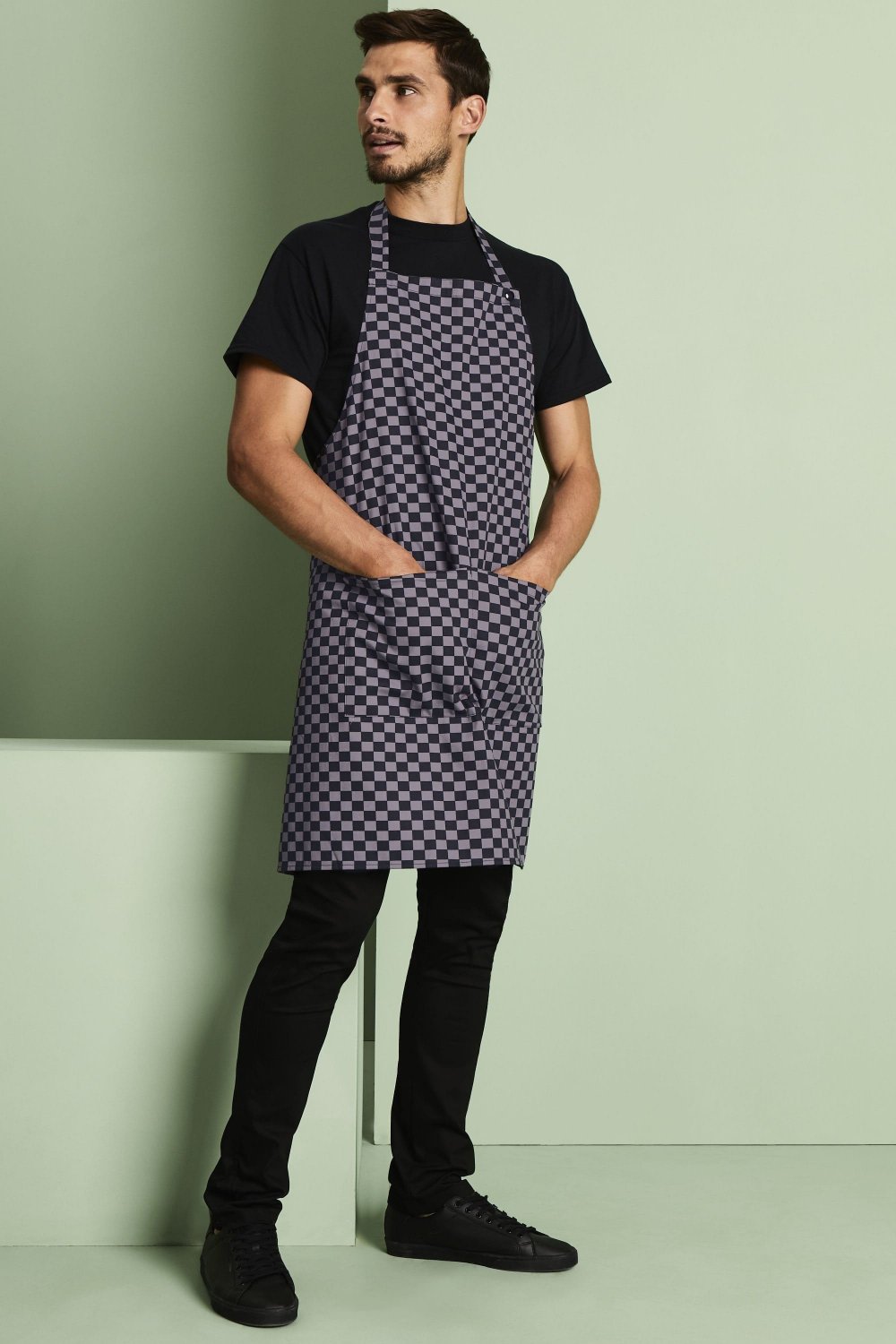 Men's Essentials Popper Strap Apron with Pocket, Grey and Black Check